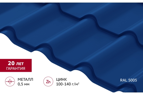 Металлочерепица "Камея" ("Kamea") v02 0,5 Satin RAL 5005 сигнальный синий