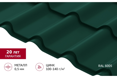 Металлочерепица "Камея" ("Kamea") v02 0,5 Satin RAL 6005 зеленый мох