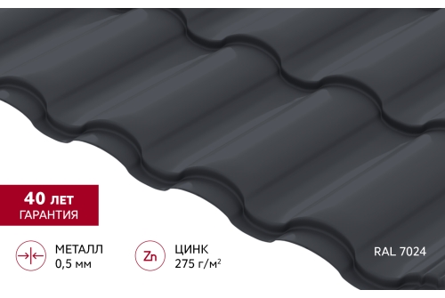 Металлочерепица "Кредо" ("Kredo") v01 0,5 PurPro RAL 7024 мокрый асфальт