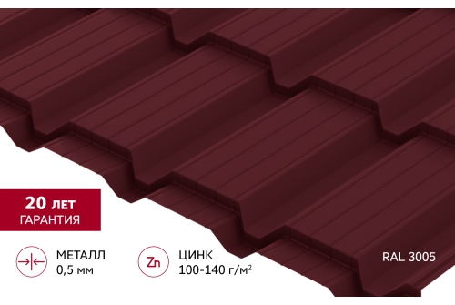 Металлочерепица "Квадро профи (Верховье)" ("Quadro Profi") v01 0,5 Satin RAL 3005 красное вино