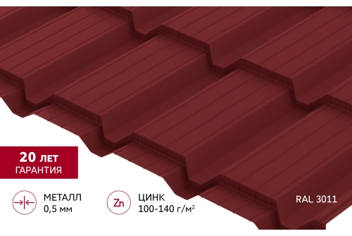 Металлочерепица "Квадро профи (Верховье)" ("Quadro Profi") v01 0,5 Satin RAL 3011 коричнево-красный