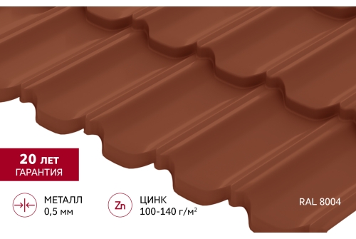 Металлочерепица "Квинта Уно" ("Kvinta Uno") 0,5 Satin RAL 8004 терракота