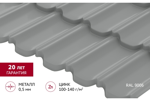 Металлочерепица "Квинта Уно" ("Kvinta Uno") 0,5 Satin RAL 9006 бело-алюминиевый
